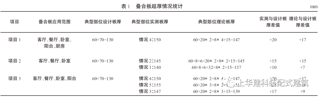采用疊合板裝配式項目普遍存在施工澆筑超厚問題,而該問題將帶來一系列不利影響。根據一些項目調研結果來看,疊合板應用范圍、典型部位設計板厚、典型部位實測板厚、典型部位理論板厚、實測與設計板厚差值、理論與設計板厚差值如表1所示。由表1可知,疊合板實測板厚>理論板厚>設計板厚。